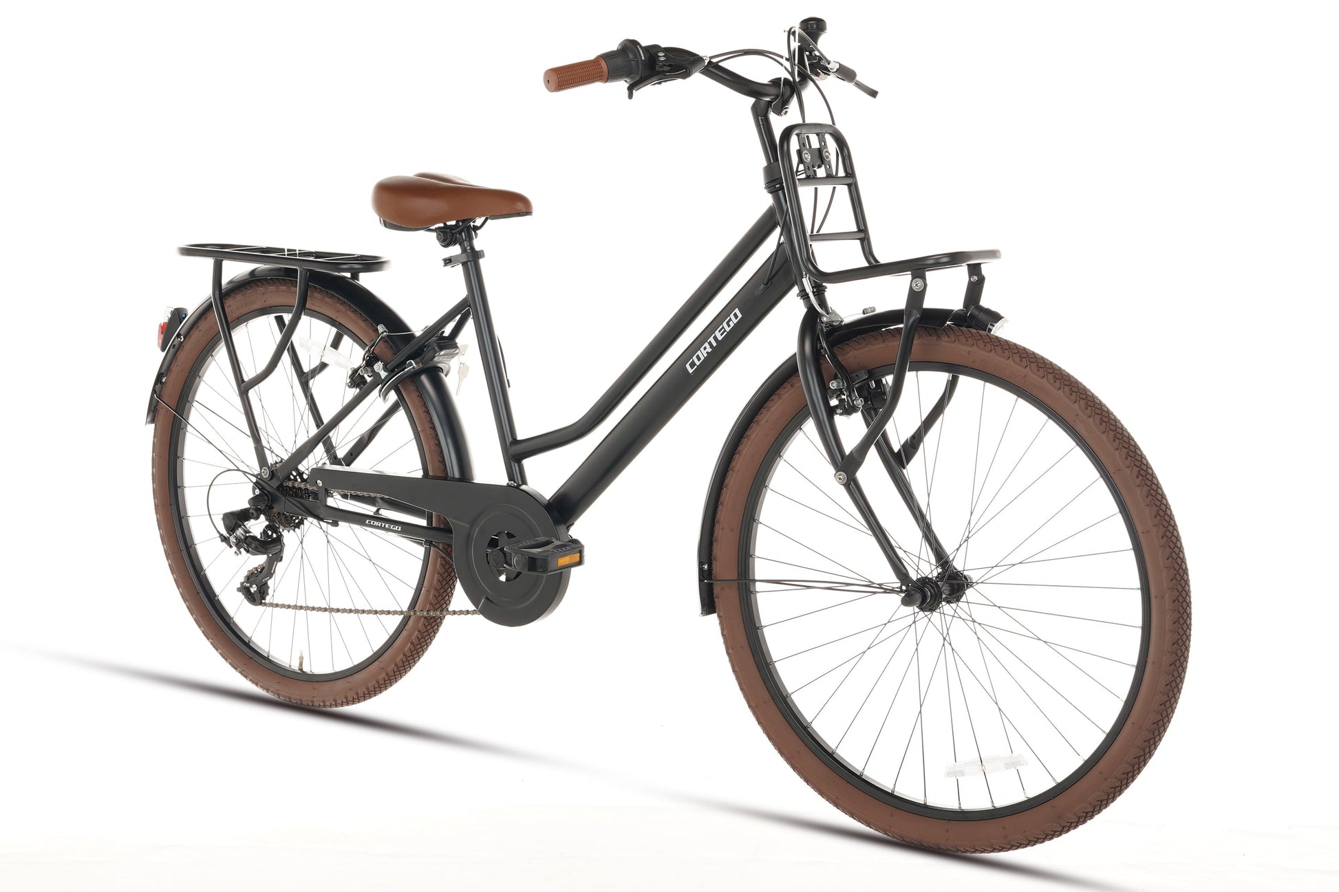 De Cortego Liberty D7 26 inch is de perfecte meisjesfiets voor meisjes die stijl en functionaliteit willen combineren. Met zijn stoere en stijlvolle uitstraling maakt deze transportfiets gegarandeerd indruk op elk schoolplein. De fiets is uitgerust met een stevige voordrager, ideaal voor het vervoeren van een kratje of andere bagage. Voor optimale zichtbaarheid is de fiets voorzien van batterijverlichting aan zowel de voor- als achterzijde, zodat uw dochter of kleindochter ook 's avonds veilig de weg op kan.