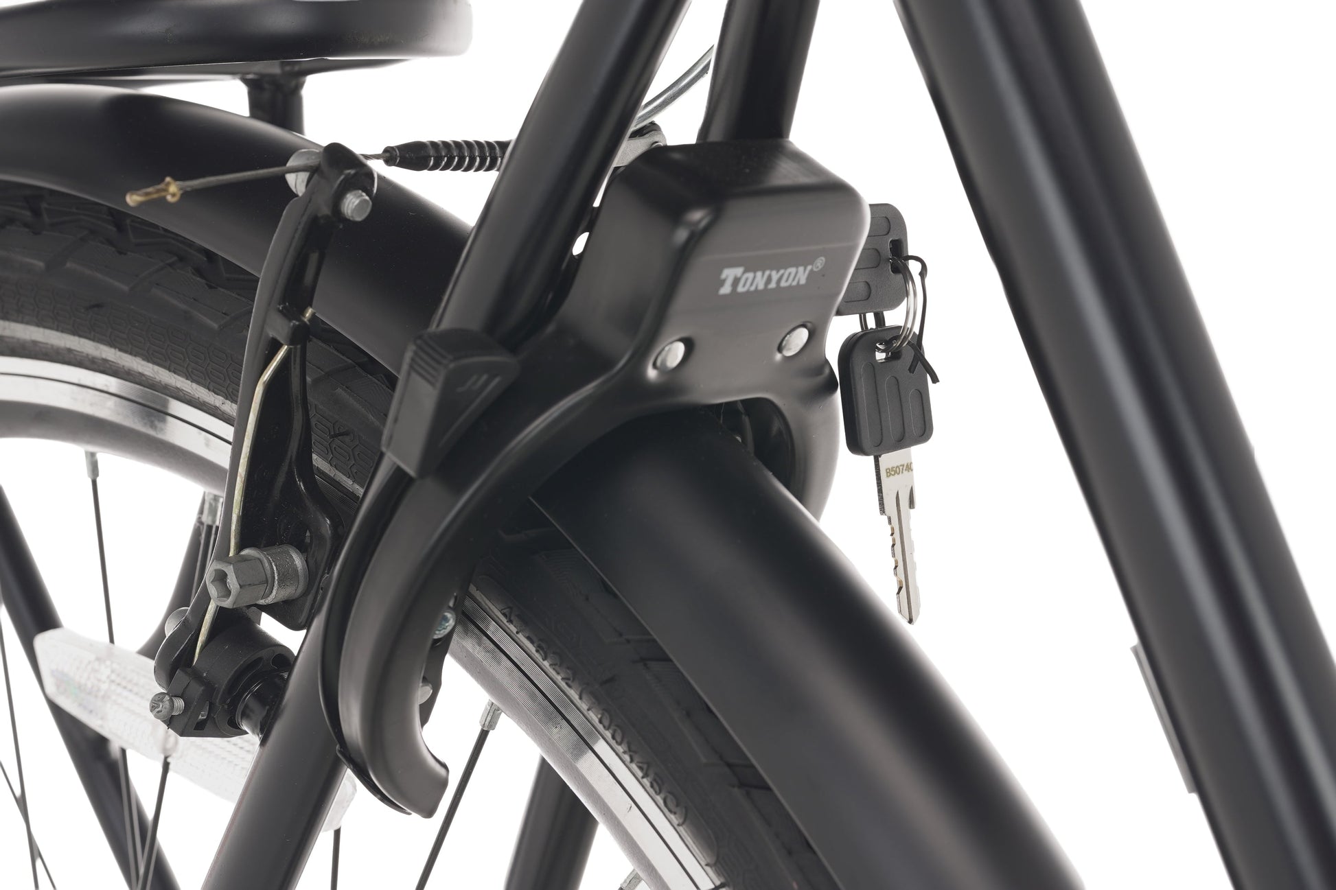 Voor veilig en direct remmen is de fiets uitgerust met handremmen (V-brakes) voor en achter. Deze remmen reageren snel en geven je een zeker gevoel, ook in druk stadsverkeer. De heldere LED-verlichting aan voor- en achterkant zorgt ervoor dat je altijd goed zichtbaar bent, zowel overdag als ’s avonds.