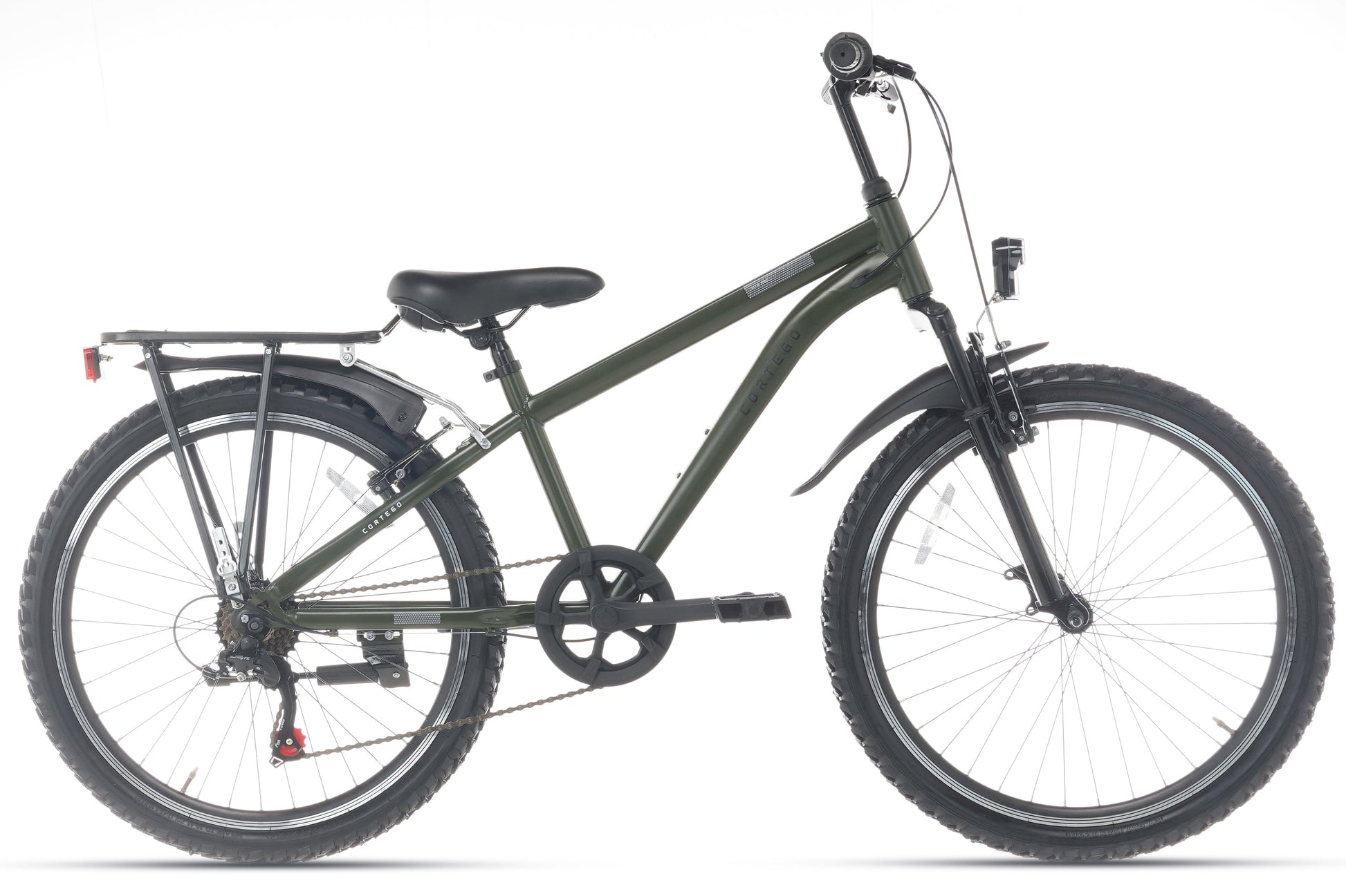 De Cortego Ranger is voorzien van een zeer stevig frame dat tegen een stootje kan en een verende voorvork die schokken absorbeert voor extra comfort op ruwe paden. De 24-inch wielen met stevige banden zorgen voor uitstekende grip en stabiliteit, terwijl de betrouwbare remmen je veiligheid waarborgen, zelfs tijdens uitdagende ritten. Voor extra gemak is de fiets uitgerust met een handige fietsbel, zodat je jezelf goed hoorbaar kunt maken in drukke omgevingen.